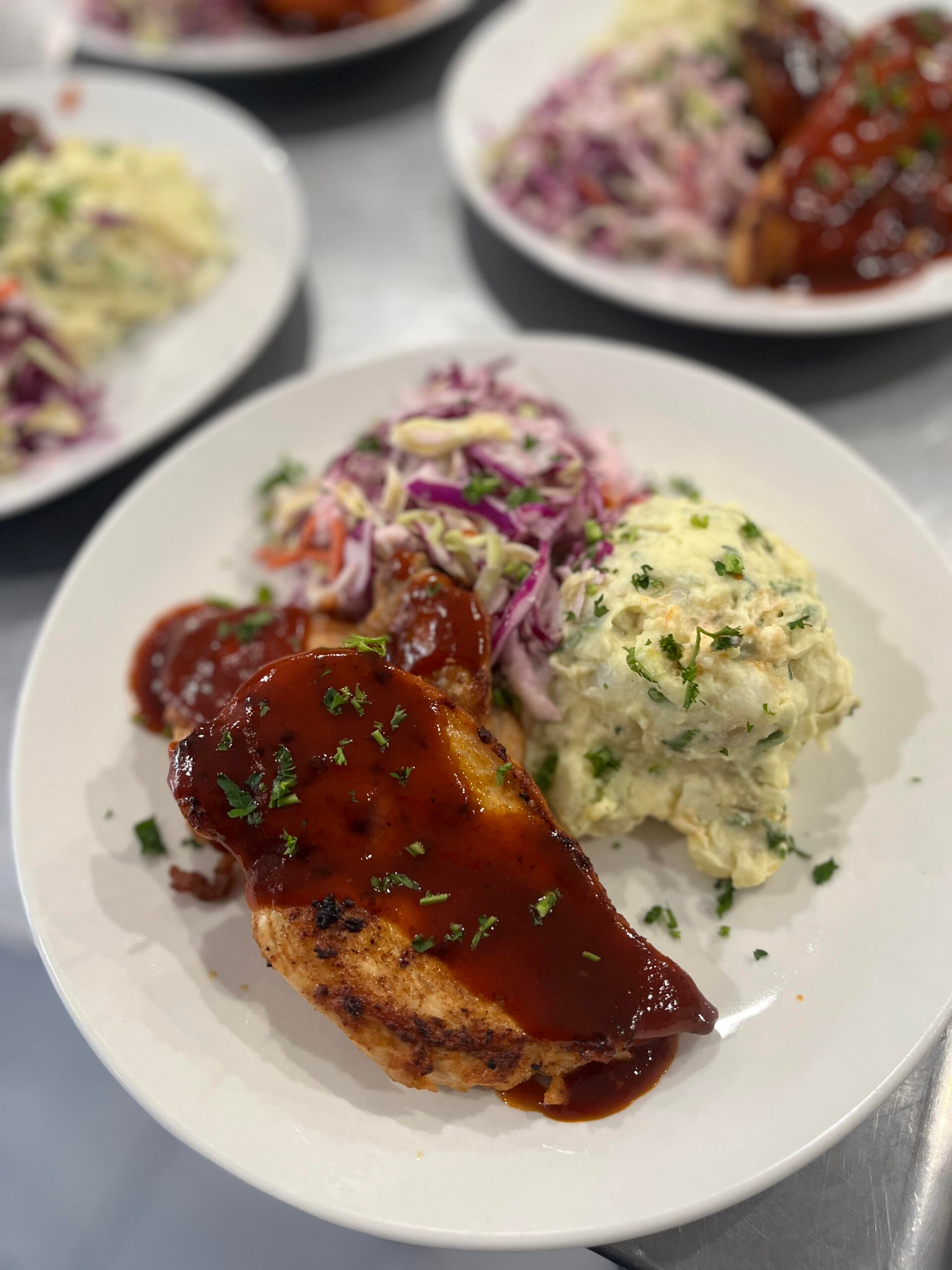 Deviled Egg and Confit Garlic Potato Salad with Honey and Fresno Chile BBQ Sauce